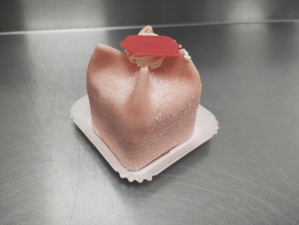 Kasteeltje opgebouwd met 3 lagen kapsel, crème met een vleugje marasquin, een laagje kersenmoes en ingerold in roze marsepein. Afgemaakt met een crème rozet en een roze chocoladeflik