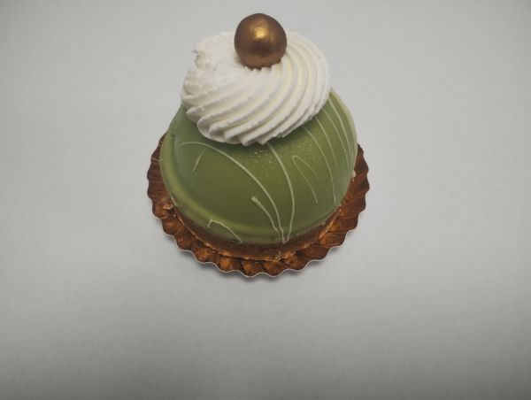 Afgewerkt met pistache chocolade, witte chocolade en slagroom.