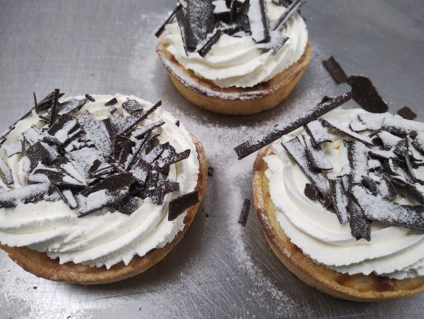 Rijstelvlaai afgewerkt met slagroom en pure chocolade.