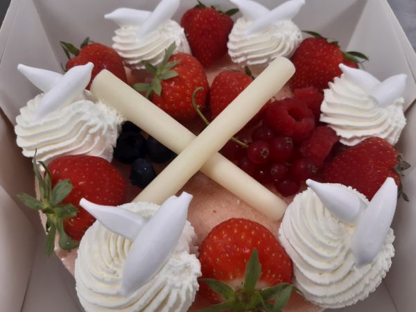 Afwerkt met een aardbeispiegel, slagroom, schuim en vers fruit.