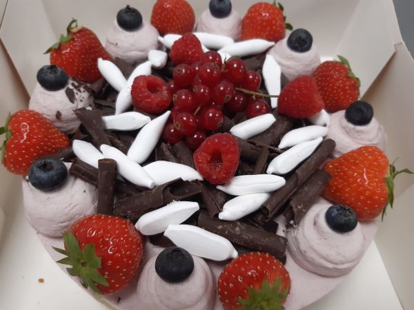 Afgewerkt met pure chocolade,vers fruit en meringue.