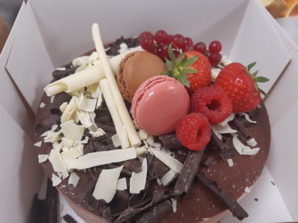 Afgewerkt met melk en witte chocolade ,vers fruit en 2 macarons