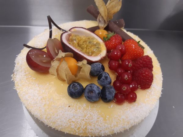 Harde wener bodem ingesmeerd met pure chocolade Passievrucht bavaroise Afgewerkt met kokos en vers fruit Verkrijgbaar in: 6-8-12 pers