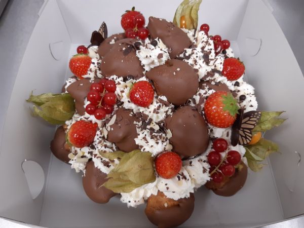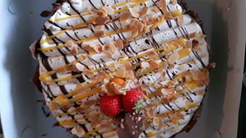 Afgewerkt met slagroom,chocolade en vers fruit.