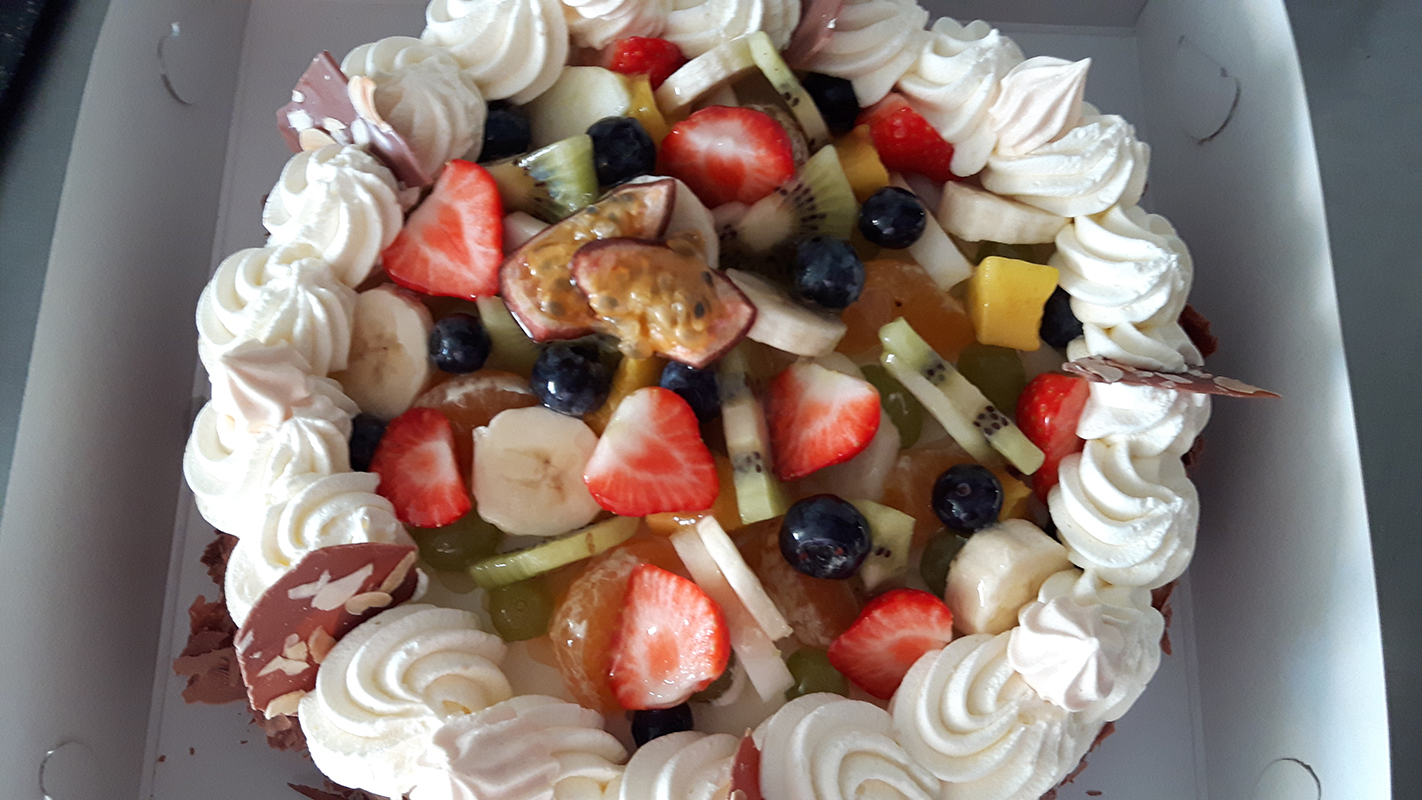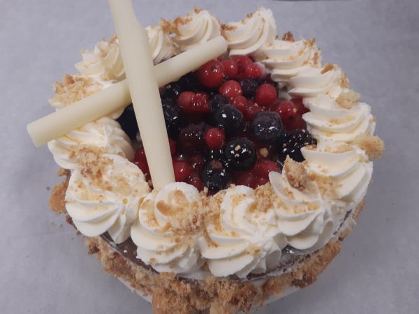 Biscuit taart gevuld met bosvruchten jam en slagroom, afgewerkt met vers fruit.