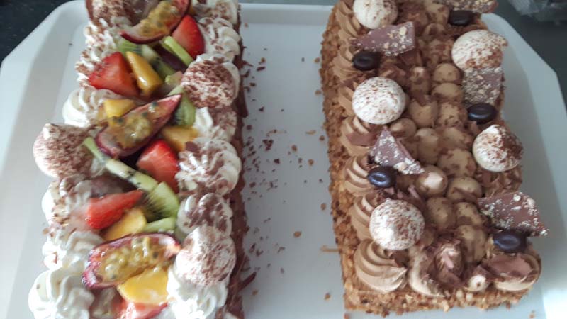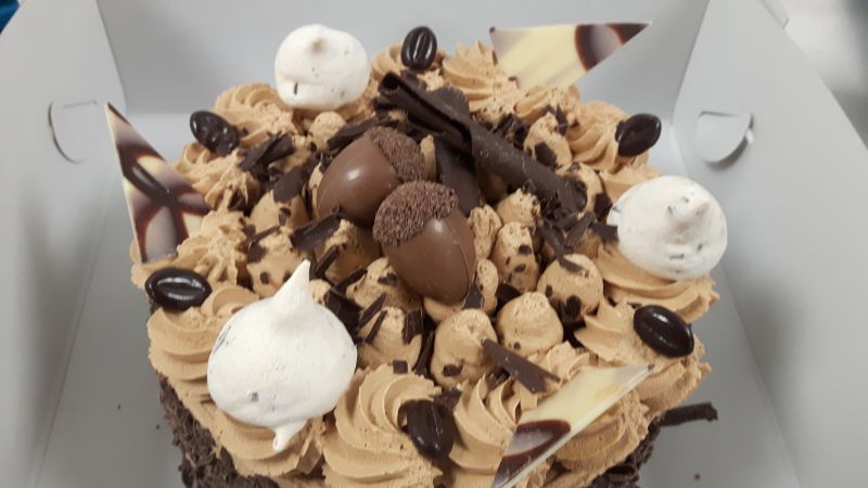 Chocolade biscuit gevuld met karamel room en hazelnoot praline. Rondom ingesmeerd met vanille boter crème Afgewerkt met pure chocolade ganache