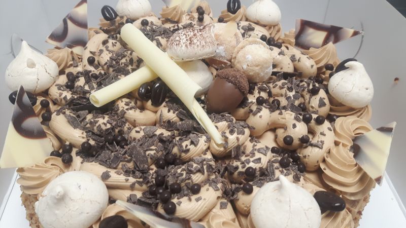 Biscuit taart gevuld en afgewerkt met mokka slagroom