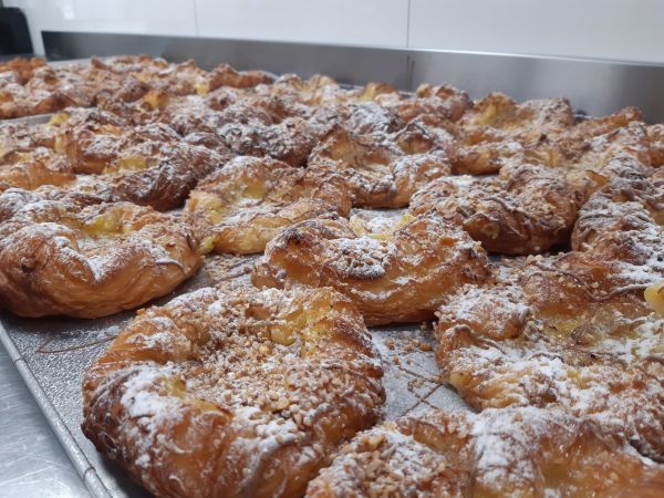 Bladerdeeg gevuld met frambozen vulling met een laagje banketbakkersroom.