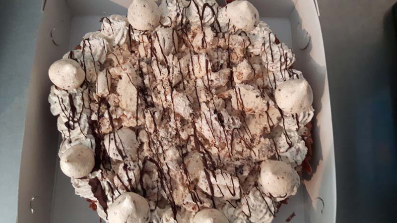 Schuimplakken met chocolade stukjes ingesmeerd met chocolade.
